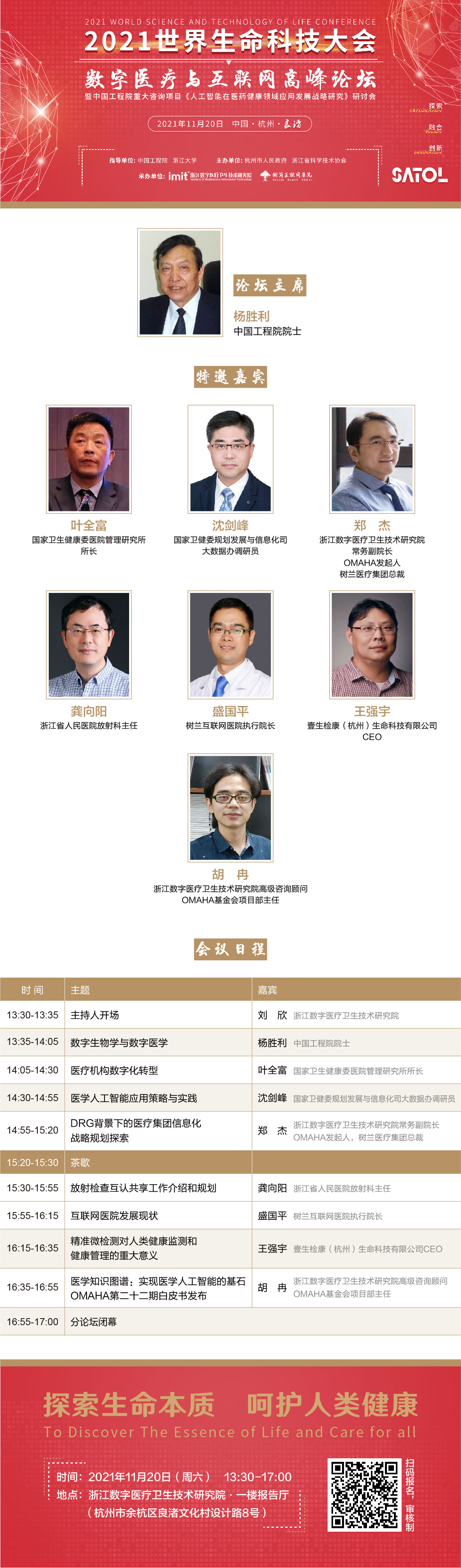 为进一步践行科技兴国精神,推进前沿生命科技发展,兹定于2021年11月19日—21日于杭州余杭举办“2021第五届世界生命科技大会”。届时将设开幕式以及八个分论坛活动,包括国际感染暨国家微生态高峰论坛、国际肝胆胰暨国际器官保护峰会、数字医疗与互联网高峰论坛暨中国工程院重大咨询项目《人工智能在医药健康领域应用发展战略研究》研讨会、中医药创新峰会、皮肤病诊疗新进展、胃肠肿瘤外科手术并发症诊疗现状和研究进展、骨科高峰论坛暨骨科机器人培训班和国际医学影像高峰论坛暨社会办医放射分会成立大会。